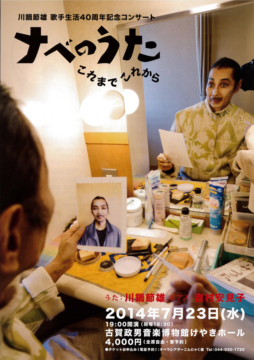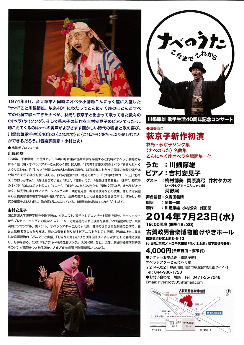 1974年3月、音大卒業と同時にオペラ小劇場こんにゃく座に入座した"ナベ"こと川鍋節雄。以来40年にわたってこんにゃく座のほとんどすべての公演で歌ってきたナベが、林光や萩京子と出会って歌ってきた数々の〈オペラ〉や〈ソング〉、そして萩京子の新作を吉村安見子のピアノでうたう。聴こえてくるのはナベの美声がよびさます懐かしい時代の響きと歌の喜び。川鍋節雄歌手生活40年の〈これまで〉と〈これから〉をたっぷり楽しむことができるだろう。(音楽評論家・小村公次)