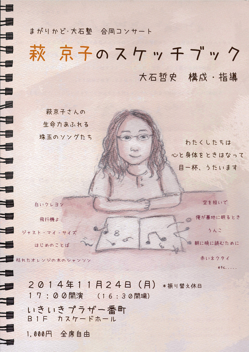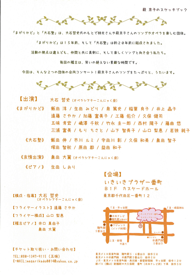 「まがりかど」と「大石塾」は、大石哲史氏のもとで林光さんや萩京子さんのソングやオペラを楽しむ団体。「まがりかど」は15年前、そして「大石塾」は約20年前に結成されました。活動の拠点は違えども、仲間と共に真剣に、そして楽しくソングと向き合う私たち。毎回の稽古は、笑いの絶えない素敵な時間です。今回は、そんな2つの団体の合同コンサート!萩京子さんのソングをたっぷりと、うたいます。