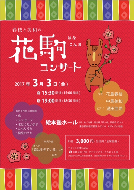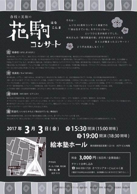 春枝と美和の『花駒(はなこんま)コンサート』三月三日のひな祭りの日に、東京・四ッ谷の絵本塾ホールにてコンサートを開催いたします!こんにゃく座からは花島春枝が出演。