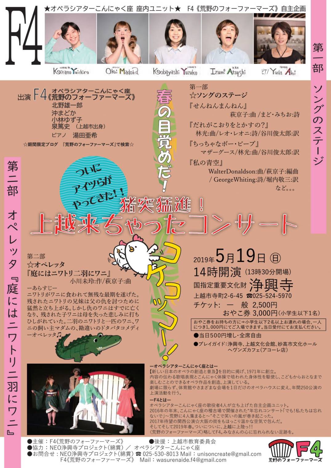 第1部はこんにゃく座のソングの数々、第2部はオペレッタ『庭にはニワトリ二羽にワニ』(小川未玲 作、萩京子 曲)楽しく可笑しくお魅せします♪お見逃しなく!!