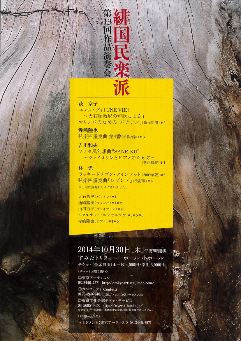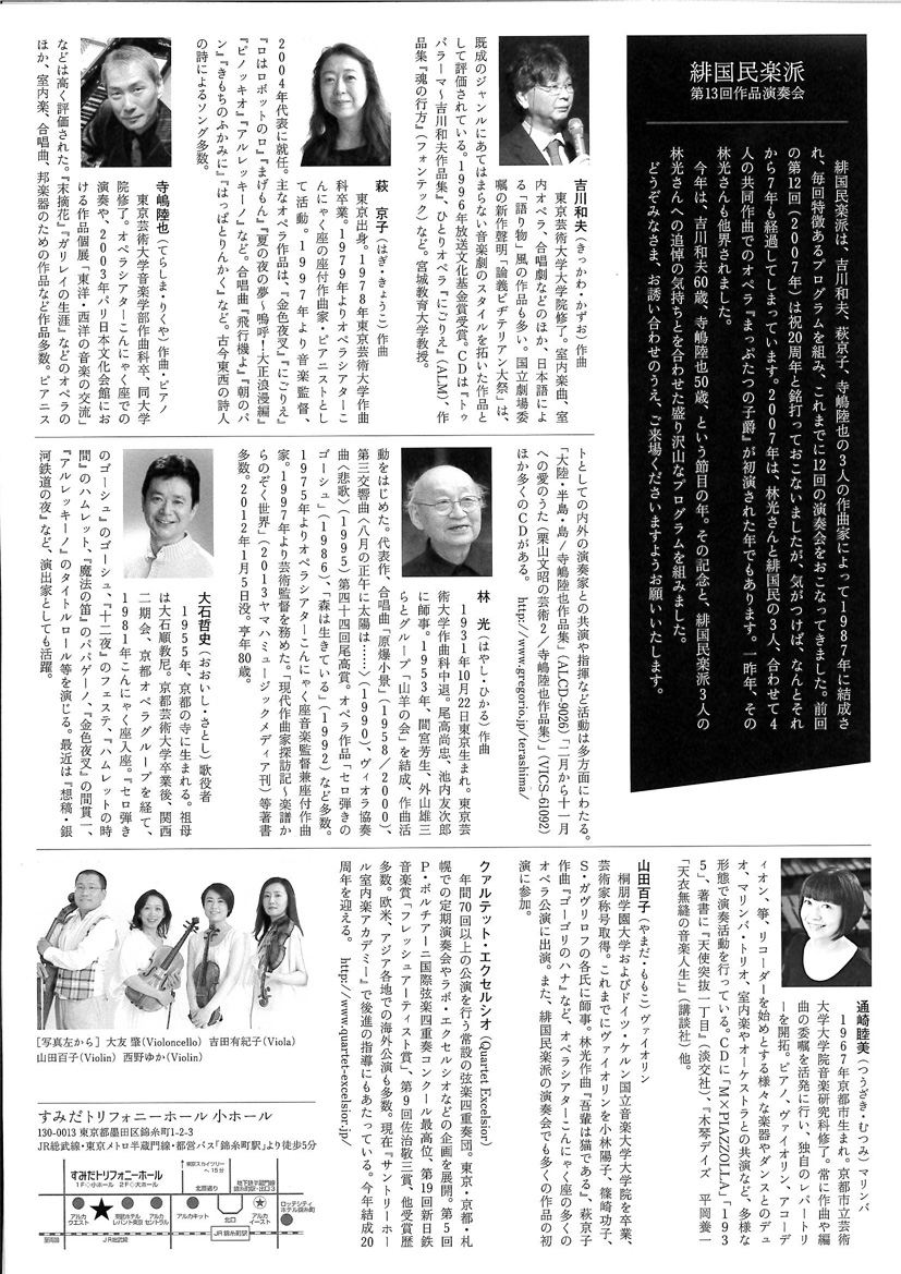 緋国民楽派は、吉川和夫、萩京子、寺嶋陸也の3人の作曲家によって1987年に結成され、毎回特徴あるプログラムを組み、これまでに12回の演奏会をおこなってきました。前回の第12回(2007年)は祝20年と銘打っておこないましたが、気がつけば、なんとそれから7年も経過してしまっています。2007年は、林光さんと緋国民の3人、合わせて4人の共同作曲でオペラ『まっぷたつの子爵』が初演された年でもあります。一昨年、その林光さんも他界されました。